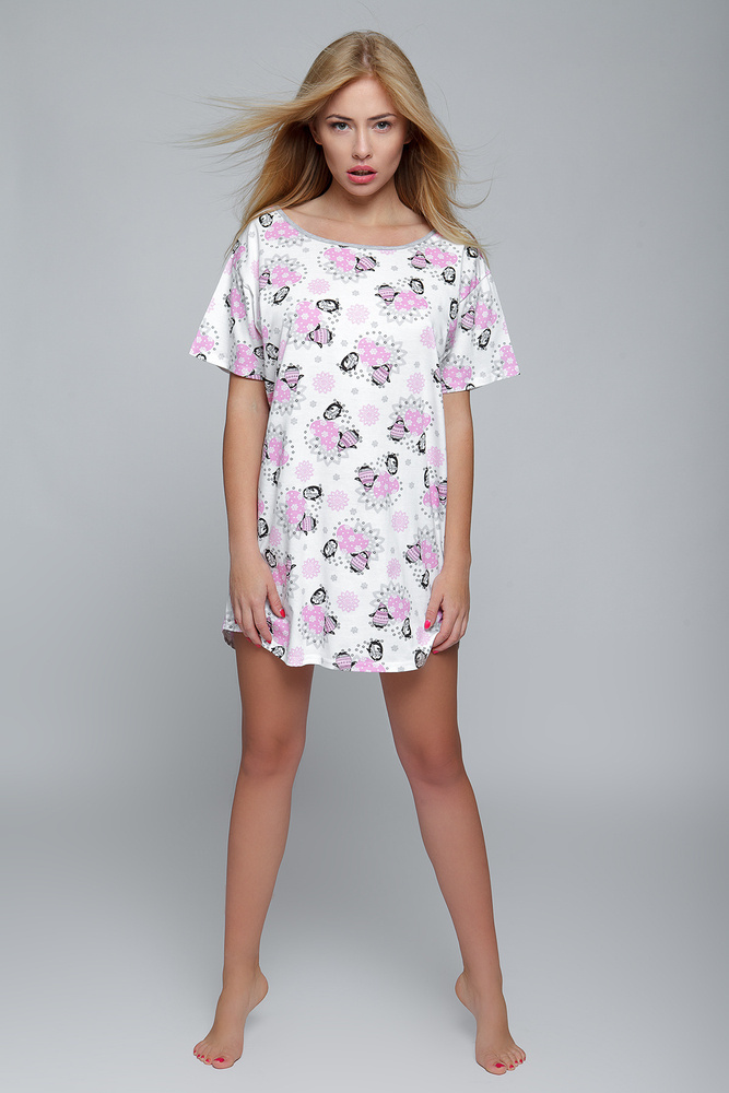 Damenhemd aus hochwertiger 100%iger Baumwolle, die in Kombination mit dem lockeren Schnitt für maximalen Tragekomfort sorgt. Gewährleistet vollständige Bewegungsfreiheit. Origineller großer Oversize-Ausschnitt, kann sexy über die Schulter gestreift werden. Kurzärmeliges T-Shirt mit Pinguin-Muster. Halbkreisförmiger Abschluss an der Unterseite. Es wird Frauen ansprechen, die Weichheit und Freiheit lieben.