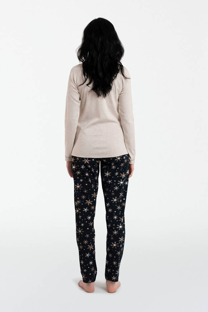 Modische Damenpyjamas sind ideal für Geschäftsreisen und Urlaube, aber auch für zu Hause. Sein schlichter, klassischer Schnitt ist eine Garantie für Komfort und Freiheit, und das natürliche Material sorgt in kalten Nächten für ausreichenden Wärmekomfort. Schlafanzug aus Baumwolle mit langer Hose und langen Ärmeln, mit rundem Halsausschnitt, darunter eine dekorative, charmante Schleife und ein hübsches Schneeflockenmuster. Diese femininen Pyjamas versprechen eine angenehme Nachtruhe. Die Damenpyjamas sind in den Größen S bis XL und in den Farben Schwarz und Melange-Beige erhältlich.