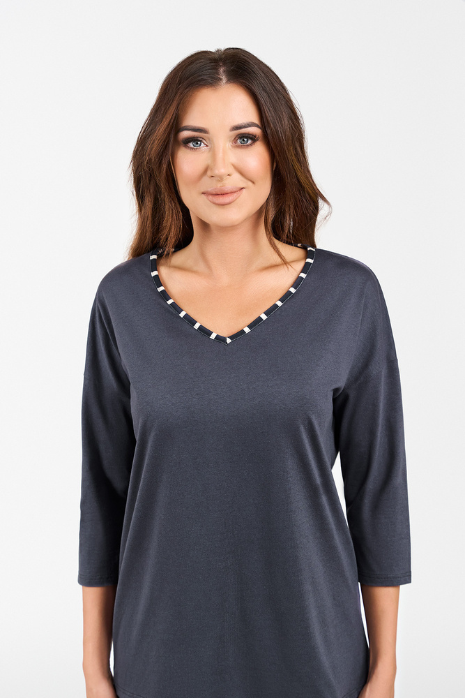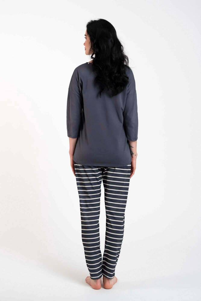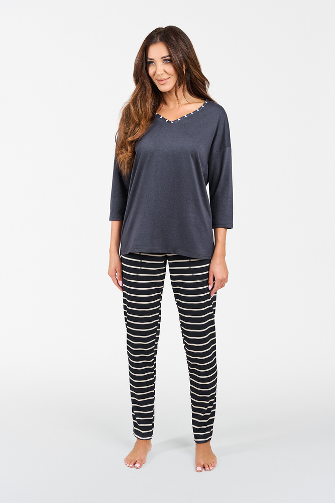 Der Baumwollpyjama für Damen mit langer Hose und ¾-Ärmeln ist ein klassisches Schlafset, ideal für kühlere Nächte. Das leichte Material lässt die Haut atmen und die lockere Passform sorgt für Komfort und Bewegungsfreiheit. Dieser ultrabequeme Damenpyjama hat eine Hose mit Streifenmuster, während das Oberteil mit einem V-Ausschnitt mit zartem Muster versehen ist. Die Leichtigkeit und Eleganz dieses Damenpyjamas wird jeder Frau gefallen. Die Pyjamas aus 100% Baumwolle sind in zwei Farben - Graphit und Cappuccino - und in den Größen S bis XXL erhältlich.