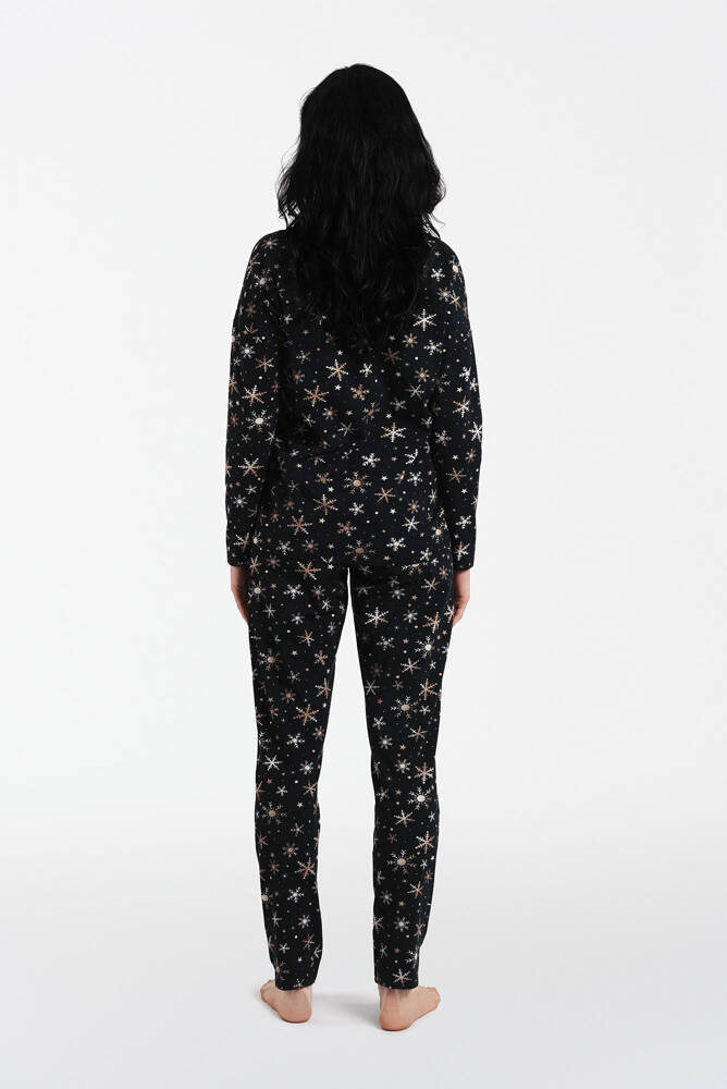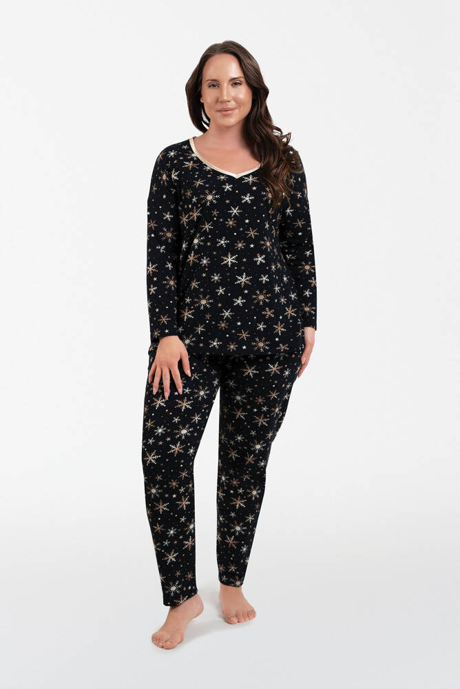 Der perfekte Pyjama für kalte Nächte? Nicht nur warm, sondern auch... in Schneeflocken! Dieser hübsche, mit einem schönen Schneeflockenmuster verzierte Damenpyjama wird jede Frau begeistern. Der Baumwollpyjama hat einen geraden Schnitt, der die Bewegungsfreiheit nicht einschränkt und Komfort garantiert. Langärmeliges Pyjama-Oberteil für Damen mit langer Hose und Rundhalsausschnitt aus dekorativem Satin. Niedliche Schneeflocken sind überall auf den Pyjamas. Dieser modische Damenpyjama ist in den Größen S bis XXL erhältlich, in schwarz mit beigefarbenen Tönen.