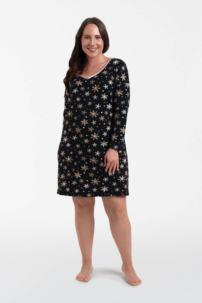 Das Nachthemd aus Baumwolle ist ideal für kalte Nächte. Die lockere Passform sorgt für volle Bewegungsfreiheit und Komfort, während das natürliche Material Sie warm und bequem hält. Das Damenschlafshirt hat ein wunderschönes, originelles Schneeflockenmuster, das seinen Charme ausmacht, sowie einen herzförmigen Ausschnitt, der mit einer eleganten Zierborte abgeschlossen ist. Das Hemd hat eine Länge bis zum Knie, wodurch es an jeder Figur sehr formschön aussieht. Das Damennachthemd ist in den Größen S bis XXL erhältlich, in Schwarz mit Beigetönen.