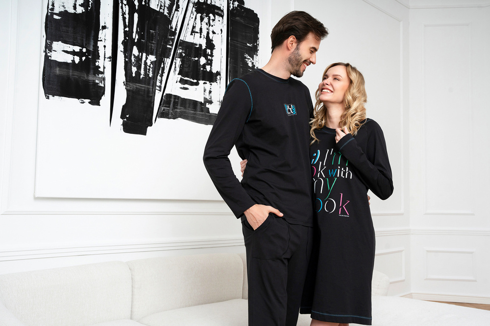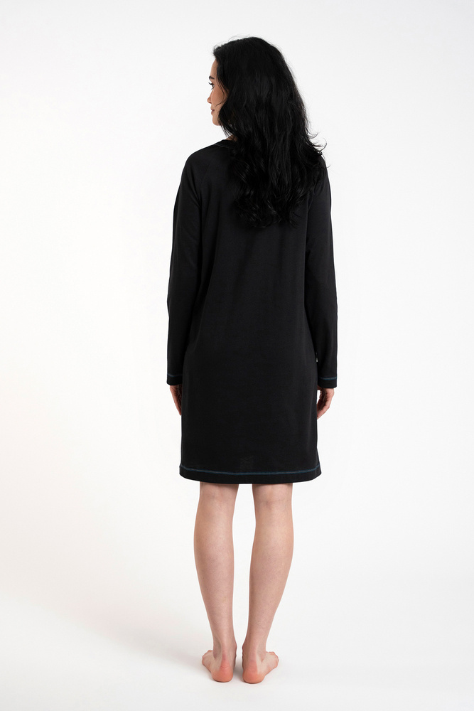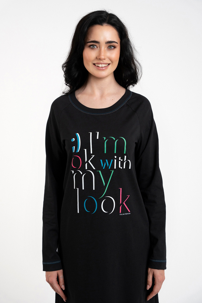 Ein modisches Nachthemd macht jede Nacht angenehmer. Das natürliche Material lässt die Haut atmen, während der gerade Schnitt und die Länge unterhalb des Knies für Komfort und Bewegungsfreiheit sorgen. Das Damen-Schlafshirt hat einen klassischen Rundhalsausschnitt und ist auf der Vorderseite mit einer attraktiven Grafik verziert - einem farbenfrohen Siebdruck-Schriftzug, der auch nach vielen Wäschen nicht verblasst. Der Stil dieses interessanten Damen-Nachthemds spricht jede Frau an. Nachthemd aus Baumwolle in den Größen S bis XXL und in Schwarz erhältlich.