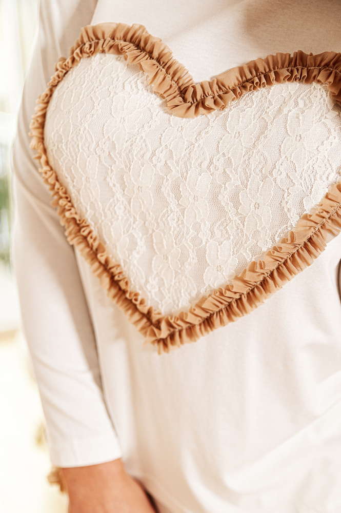 Langärmelige Bluse mit etwas lockererem Schnitt, die mit einem in zarten Tüll gehüllten Spitzenherz verziert ist. Das Set enthält auch eine lange Hose mit Taschen, die mit Tüllrüschen verziert sind.