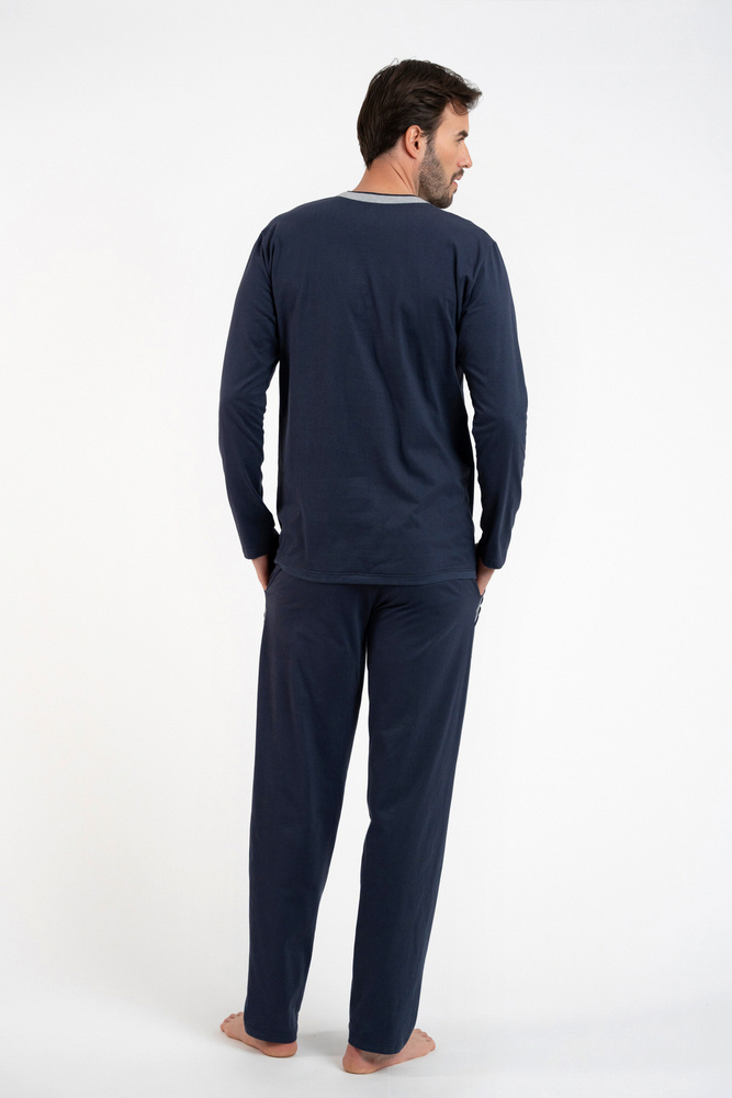 Schlichtheit und Komfort sind die größten Vorzüge dieses klassischen Herrenpyjamas. Der langärmelige Herrenschlafanzug mit langer Hose aus 100 % Baumwolljersey ist sehr weich und angenehm auf der Haut und bietet zudem einen angemessenen Wärmekomfort. Die Pyjamahose hat zwei funktionale Taschen und einen nicht drückenden Gummizug im Tunnel, während die Bluse mit Rundhalsausschnitt mit kontrastierenden Einsätzen versehen ist. Die Baumwollpyjamas für Männer sind in den Größen M bis XXXL in zwei Farbvarianten erhältlich - marineblau und grau meliert mit marineblau.