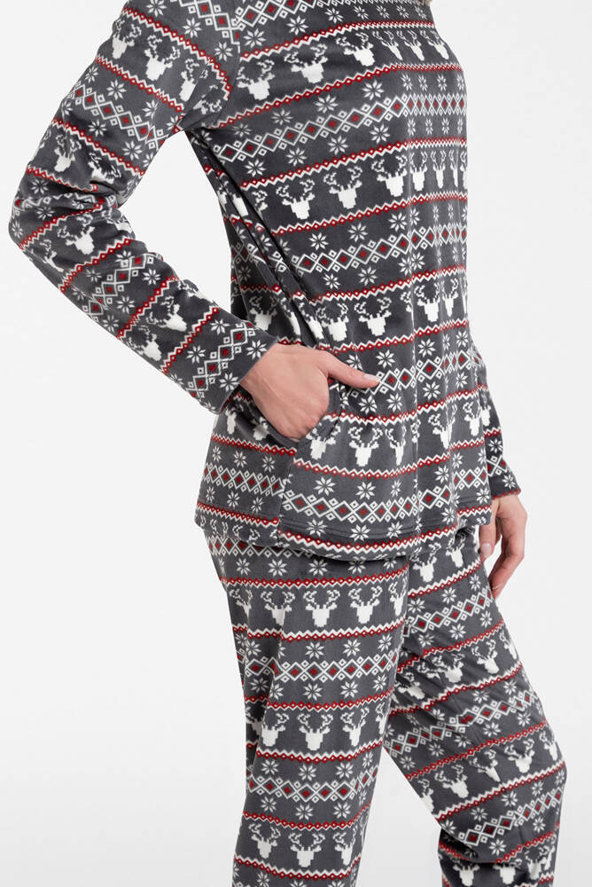 Perfekt für (nicht nur) einen festlichen Abend am Kamin - ein Damen-Fleece-Set, das sowohl ein warmer Schlafanzug als auch ein bequemer Trainingsanzug sein kann. Mit einem sehr modischen, winterlichen Muster aus Rentieren und Schneeflocken verziert, sorgt es für Wärme, Freude und Komfort. Die Hose des Damen-Fleece-Sets hat einen Kordelzug an den Beinen, während die Bluse mit einem Rundhalsausschnitt und funktionellen Taschen ausgestattet ist. Das modische Fleece-Set für Damen ist in den Größen S bis XXL erhältlich, in zwei Farbvarianten - dominiert von Rot oder Graphit.