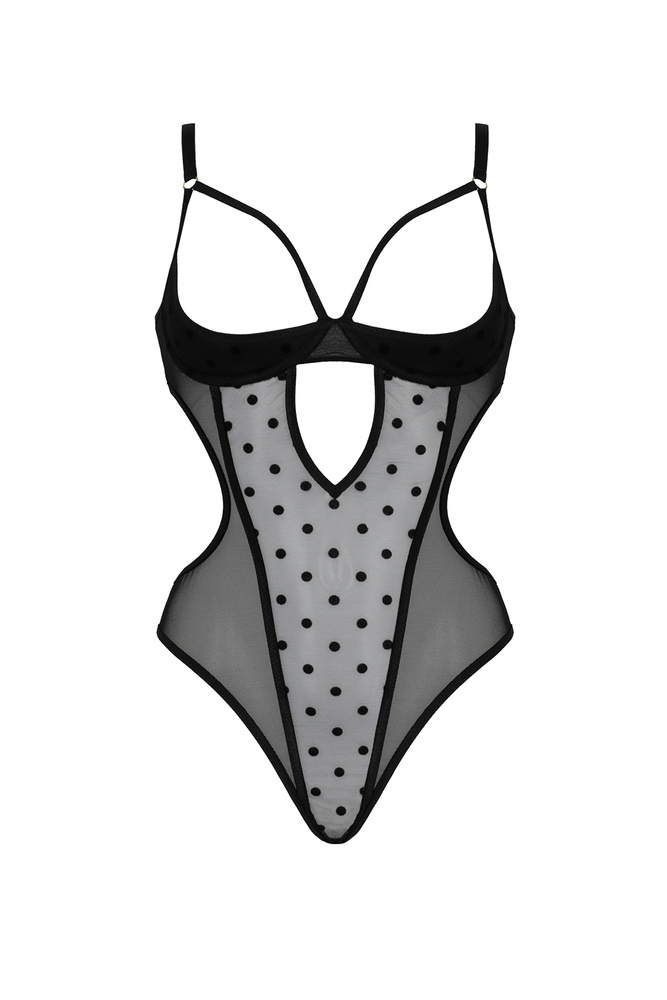 Otwarte usztywnione z fiszbiną miseczki w połączeniu z okalającymi piersi paseczkami. Wycięcia które wysmuklają sylwetkę i te urocze kropeczki… cudowne połączenie wysokiej jakości materiałów sprawiło że body prezentuje się oszałamiająco. Model dostępny w dwóch wersjach kolorystycznych - czerni i beżu.
