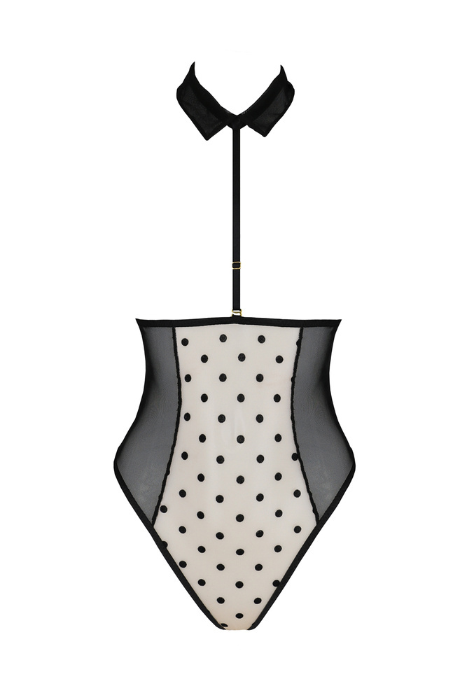 To jakże seksowne body Trisha, to propozycja od marki Passion, która skierowana jest dla kobiet, które są świadome swojego ciała i swojej kobiecości. Idealne na każdą porę i na każdą okazję, kiedy tylko chcemy postawić na dobrą zabawę. Prezentowany model odkrywa w całości piersi. Wiązanie gorsetowe w tylnej części, wpływa na komfort noszenia. Całości charakteru dodaje, seksowny, odpinany choker w postaci kołnierzyka. Model dostępny w dwóch wersjach kolorystycznych - czerni i beżu.