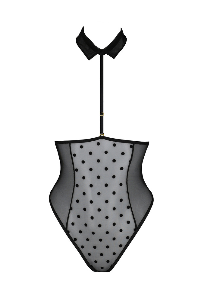 To jakże seksowne body Trisha, to propozycja od marki Passion, która skierowana jest dla kobiet, które są świadome swojego ciała i swojej kobiecości. Idealne na każdą porę i na każdą okazję, kiedy tylko chcemy postawić na dobrą zabawę. Prezentowany model odkrywa w całości piersi. Wiązanie gorsetowe w tylnej części, wpływa na komfort noszenia. Całości charakteru dodaje, seksowny, odpinany choker w postaci kołnierzyka. Model dostępny w dwóch wersjach kolorystycznych - czerni i beżu.