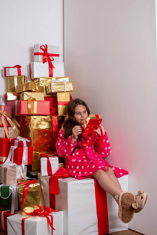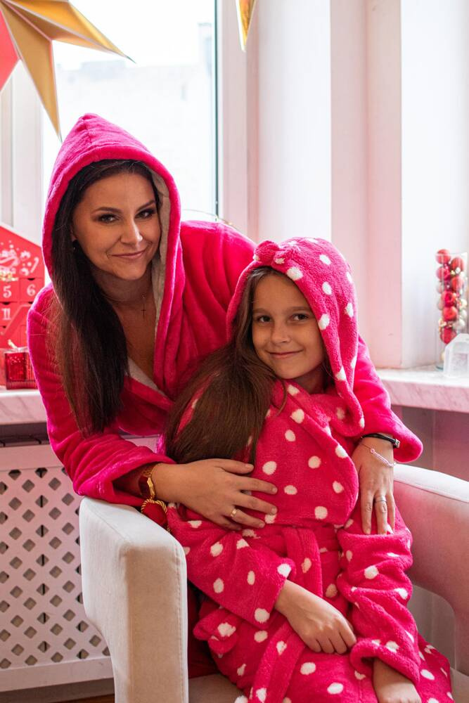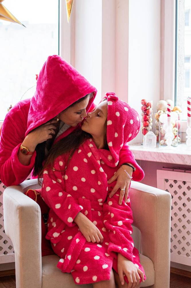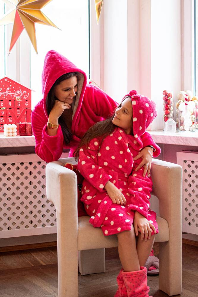 FOREX Kinderbademantel in geradem Schnitt mit Kapuze. Knielang, Seitentaschen, Bund mit Gürtel zum Binden. Alles in Erbsen. Der Bademantel passt sich perfekt der Körperform an, ist extrem weich und leicht, aus weichem Strickstoff. Es ist ein Vergnügen, sich nach dem Baden darin einzuhüllen!
