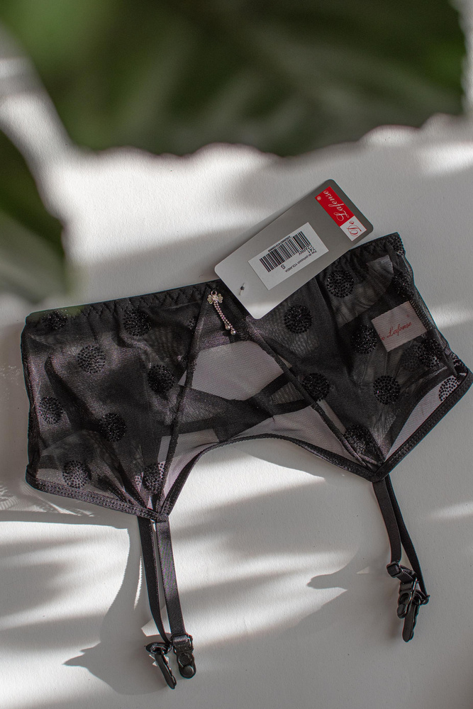 Extrem sexy Strumpfgürtel. Modell von hervorragender Qualität mit einem Schmuckelement in der Mitte. Seiten und Rücken aus weichem und griffigem Feinmesh. Befestigung mit Doppelhaken.