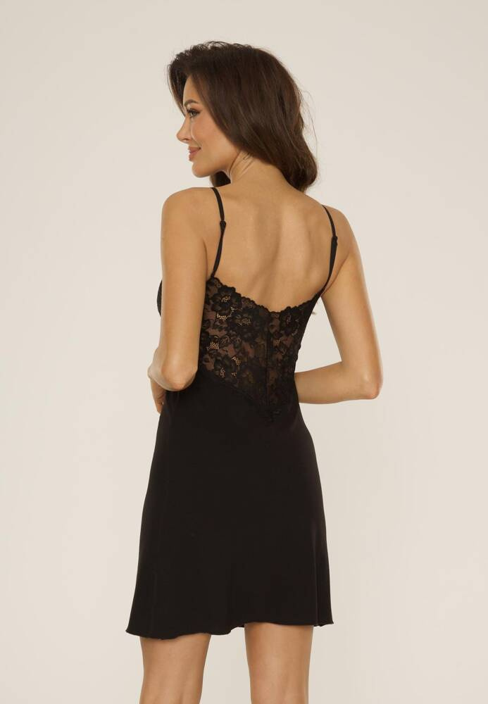 Elegantes schmal geschnittenes Damen-T-Shirt. Modell aus hochwertiger Viskose-Seide. Mit zarter Spitze am Rücken verziert. Es wird Frauen ansprechen, die Weichheit und Freiheit lieben.