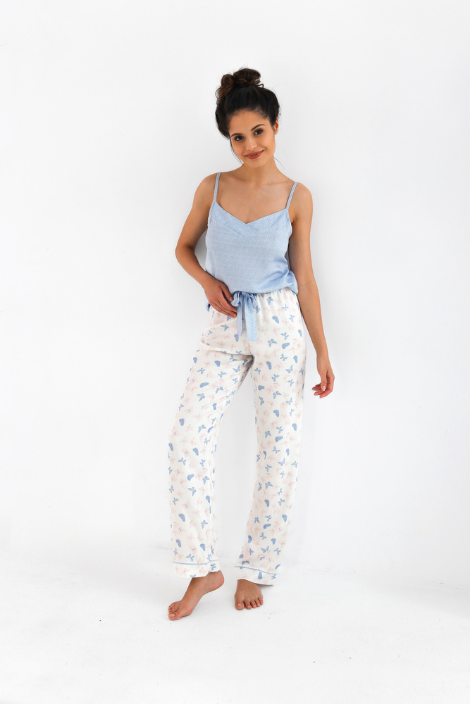 Sommerpyjama für Frauen mit Schmetterlingsmuster. Trägerloses T-shirt. Komplett mit lockerer, langer Hose. Bund mit Gummizug und Bindeband.