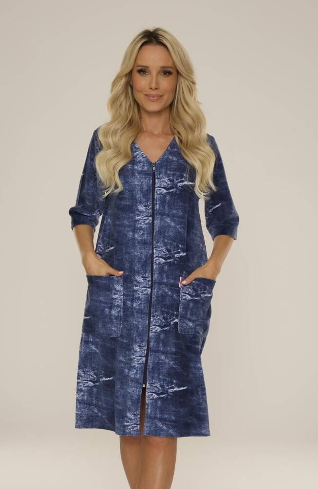 Kurzärmeliger Damenbademantel aus weichem Velours mit kurzen Ärmeln. Mit Reißverschluss, mit zwei praktischen Taschen. Der Bademantel passt sich perfekt der Körperform an, ist extrem weich und leicht. Es ist ein Vergnügen, sich nach dem Baden darin einzuhüllen!