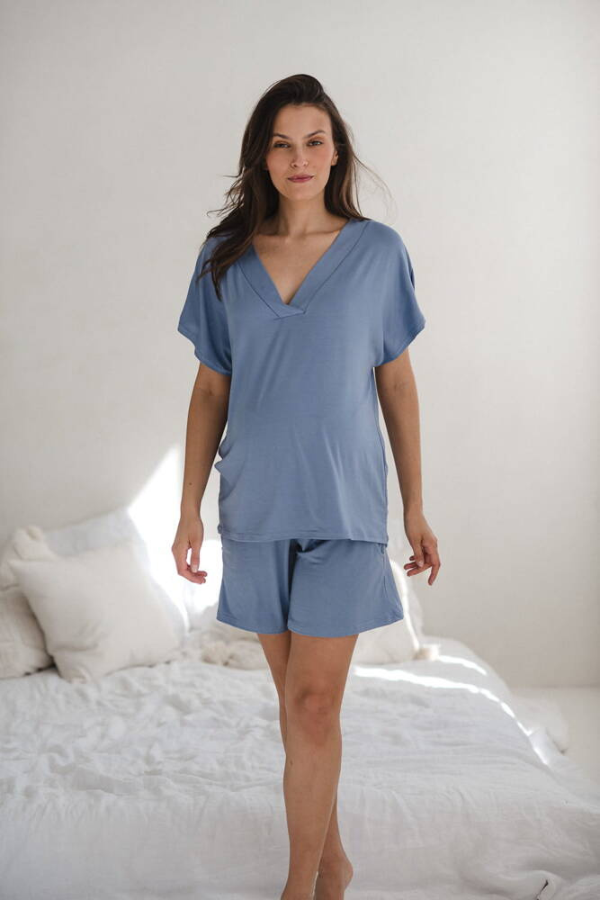 Moon bambusowa bluzka od piżamy ciążowej do karmienia krótki rękaw Milk&Love ciemny błękit