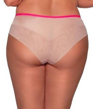 Höschen für Frauen im klassischen Schnitt . Vorderseite aus transparentem Mesh, verziert mit energiegeladener Blumenstickerei. Boden aus doppelter Mikrofaser, Bund mit flachen Enden, akzentuiert durch ein fluopinkes Gummiband. Rücken aus Mikrofaser und Doppelnetz