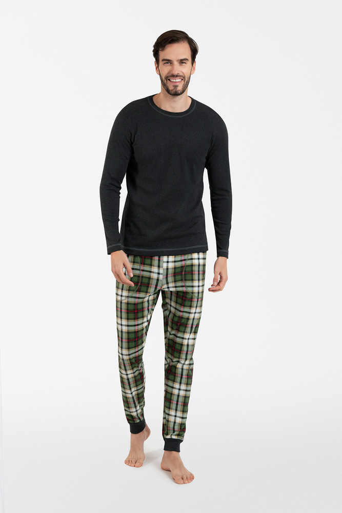 Klassischer Herrenschlafanzug mit langer Hose und langen Ärmeln, bei dem die Hose vollständig mit einem Karomuster verziert ist. Die Herrenpyjamas haben einen geraden Schnitt, der Komfort garantiert, und ein natürliches Material, das atmungsaktiv und angenehm auf der Haut ist. Die Bluse des modischen Herrenpyjamas ist mit einem Rundhalsausschnitt versehen, während die Hose einen bequemen Rippbündchen-Saum an den Beinenden hat.