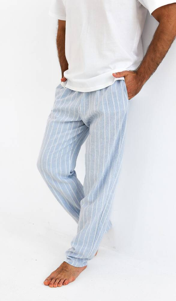 Bequemer und praktischer Herrenschlafanzug aus hochwertiger Baumwolle. Kurzärmeliges T-Shirt. Komplett mit langer, gemusterter Hose. Bequemer elastischer Bund. Modell mit Taschen.