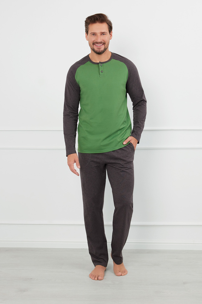 Der Pyjama für Männer hat einen bequemen Schnitt für eine angenehme Nachtruhe. Das Ganze besteht aus zwei Teilen. Das Oberteil ist in zwei kontrastierenden Farben gehalten. Es hat Raglanärmel und einen kleinen Rundhalsausschnitt, der mit knackigen Paspeln verziert ist und mit einem klassischen Poloknopfverschluss abgeschlossen wird. Der untere Teil ist eine einheitliche Hose mit geradem Bein und zwei aufgesetzten Taschen, die durch Nähte freigelegt wurden. Der gesamte Stoff besteht aus atmungsaktiver, weicher Baumwolle für thermischen Komfort.