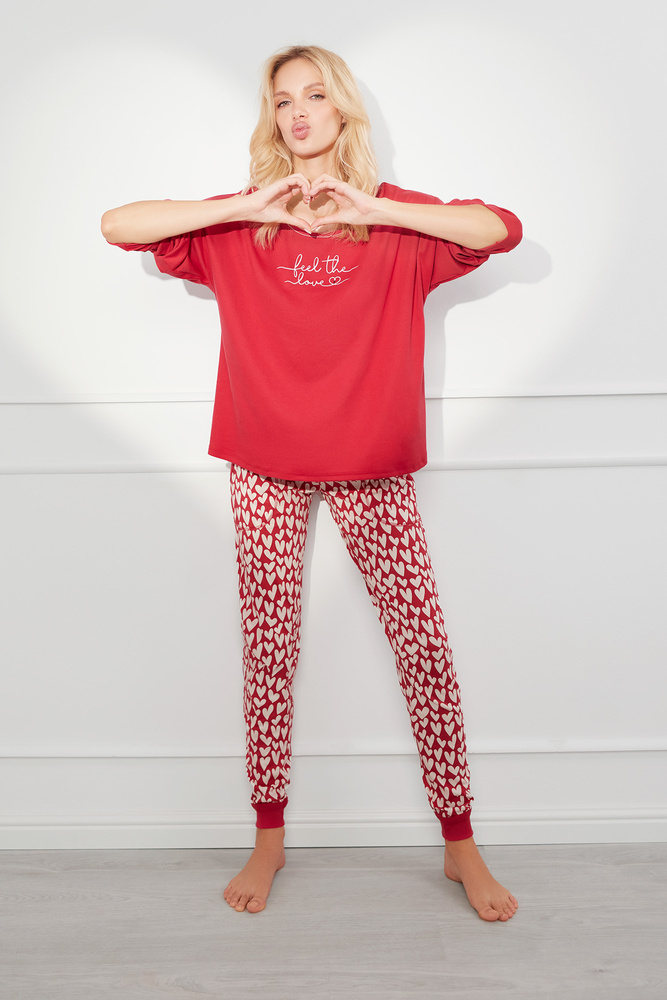 Der lange Pyjama für Frauen mit geradem Schnitt wurde für maximalen Komfort entworfen. Das Oberteil ist eine einfarbige, langärmelige Bluse mit dem Aufdruck "FEEL THE LOVE". Der Rundhalsausschnitt ist mit einem kontrastierenden Saum abgeschlossen. Die Hose mit romantischem Herzmuster hat Rippenbündchen für einen perfekten Sitz. Der gesamte Stoff ist aus bequemer und angenehm zu berührender Baumwolle gefertigt.