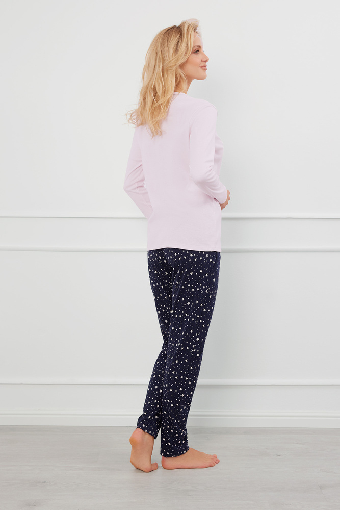 Schlafanzug für Damen aus Baumwoll-Rippstrick mit Knöpfen, der sich durch ein zeitloses Design auszeichnet. Es hat einen klassischen Schnitt mit langen Ärmeln und einem V-Ausschnitt, der mit feinem Garn in einer Kontrastfarbe eingefasst ist. Lange Hose mit modischem Sternendruck als Blickfang. Praktische, aufgesetzte Taschen an den Seiten. Die Tatsache, dass es sich um einen ungeknöpften Damenpyjama handelt, und die deutlich gekennzeichnete Knopfleiste verleihen dem ganzen Look einen Hauch von Klasse und Anmut.