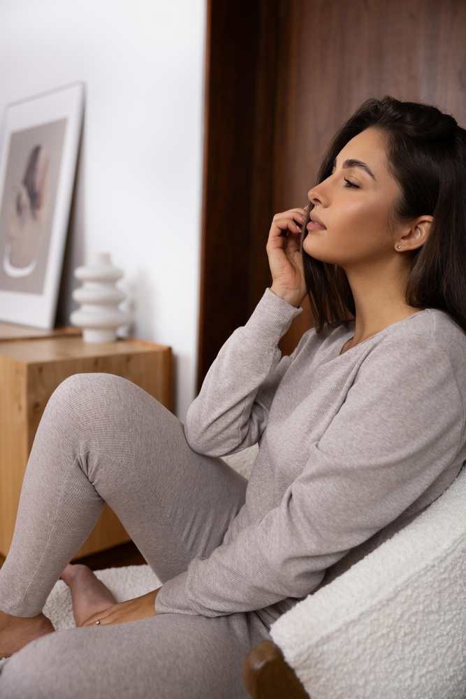 Damen-Schlafanzug aus weichem Rippenstrick. Langärmeliges T-Shirt mit Rundhalsausschnitt. Komplett mit leggingsähnlicher Hose.