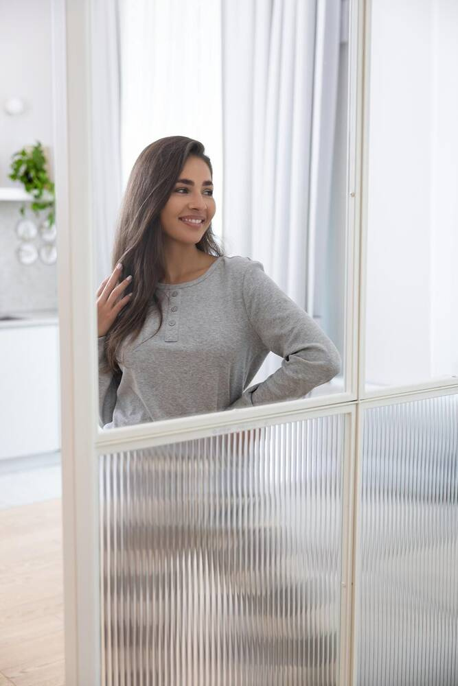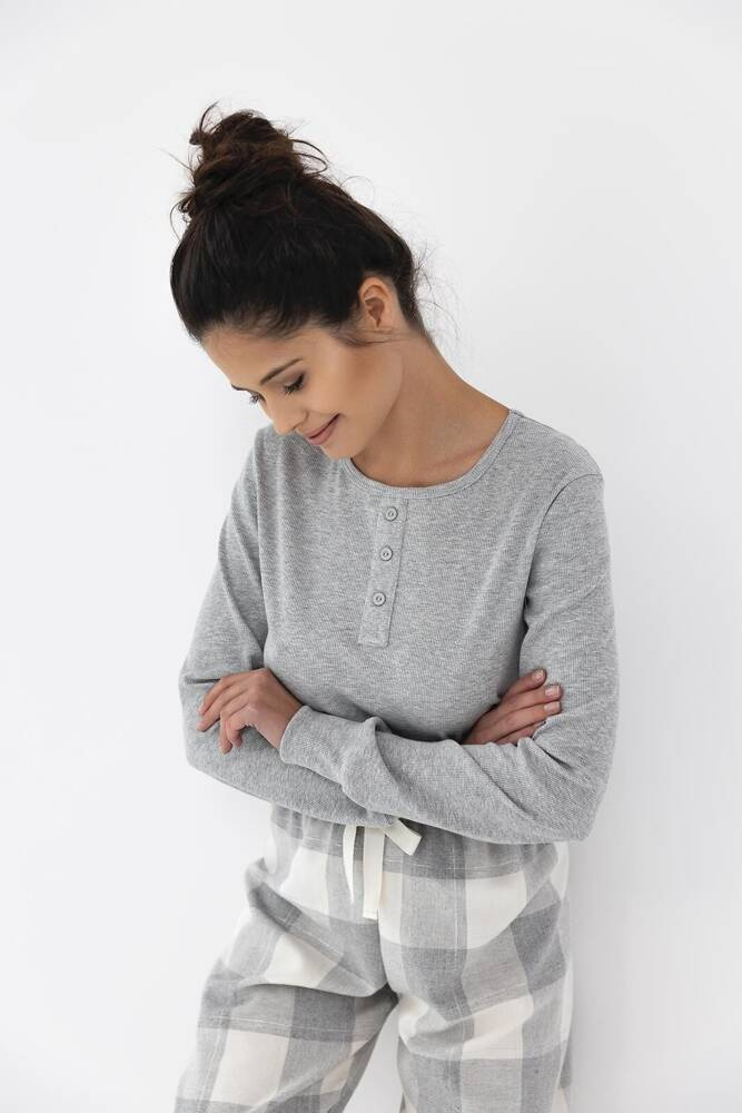 Damenpyjama aus hochwertiger Baumwolle. Langärmeliges T-Shirt, halsausschnitt mit Knöpfen verziert.