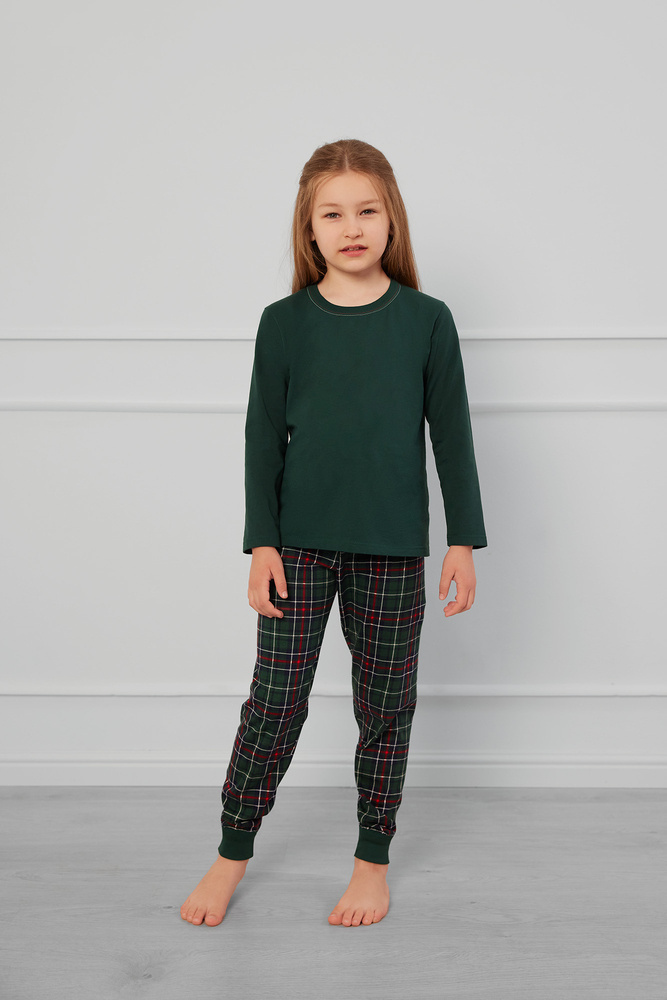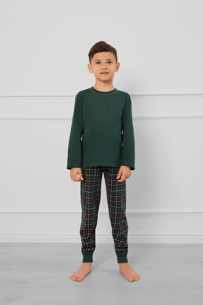 Dieser geradlinige Kinderschlafanzug besteht aus einer unifarbenen Bluse mit Rundhalsausschnitt und einer karierten Hose mit praktischem Kordelzugbund. Der klassische Schnitt schränkt die Bewegungsfreiheit nicht ein und der hochwertige, weiche Stoff ist hautfreundlich und garantiert Wärme und Komfort die ganze Nacht hindurch.