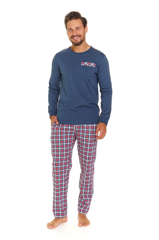 Herrenpyjama aus hochwertiger, weicher Baumwolle. Ein Modell mit klassischem Schnitt. Langarm-T-Shirt, halbrunder Ausschnitt. Lange, gemusterte Hose mit bequemem Gummibund. Es wird die anspruchsvollsten Männer ansprechen.