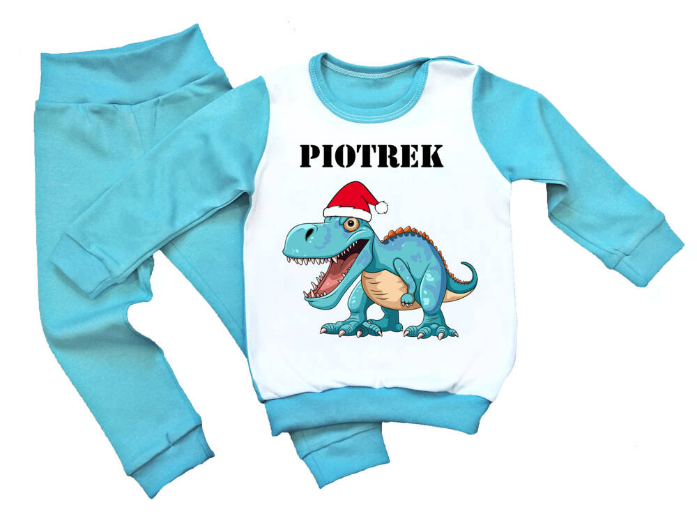 SKU P16 Weihnachtspyjama für Kinder mit einem Dinosaurier und dem Namen Moocha, blau