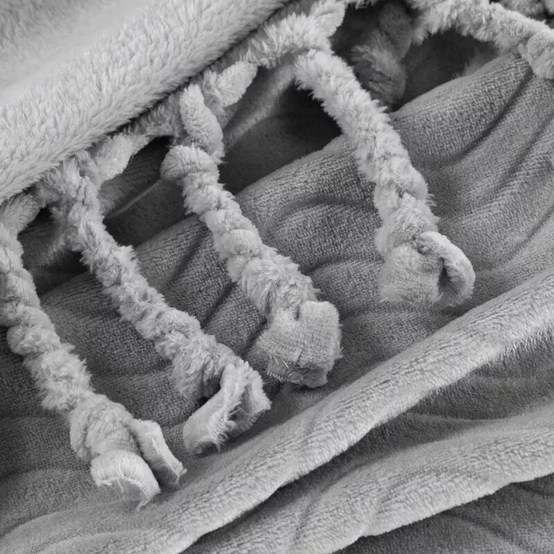 Stelle eine FrageEine elegante und angenehm anzufassende Decke, verziert mit Fransen. Das Muster mit subtilen Wellen verleiht Stil und Einzigartigkeit und macht es zu einer perfekten Ergänzung für die Inneneinrichtung. Die aus hochwertigem Polyester gefertigte Decke sorgt für Weichheit und Tragekomfort.