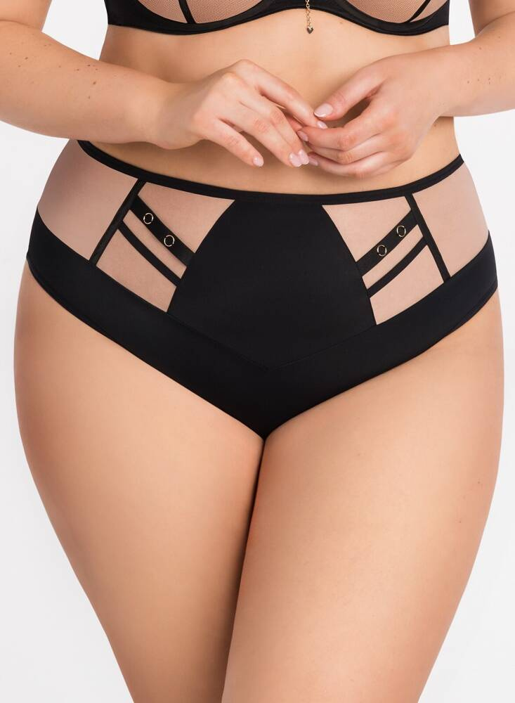 Offener Schnitt, der fast das gesamte Gesäß bedeckt. Höschen aus Mikrofaser. Nähte mit matten Bändern abgedeckt. Dekorative Streifen aus Gummibändern auf der Vorderseite. Rückseite durch Flachlegen der Mikrofaser abgeschlossen. Baumwolle im Schritt.