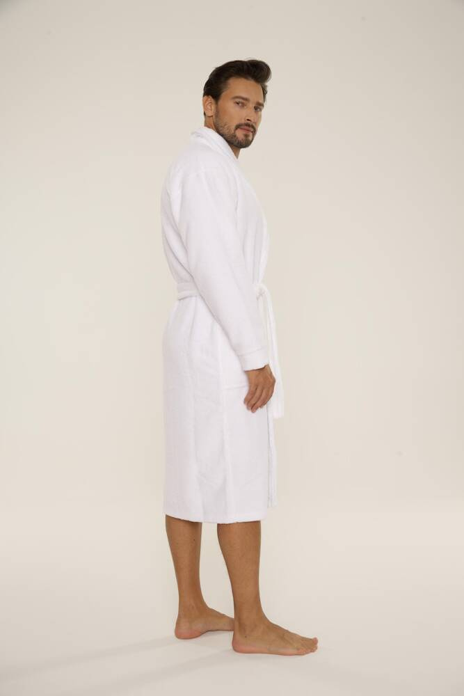 Langer Bademantel aus Velours für Männer. Modell mit Schalkragen, in der Taille gebunden, mit zwei aufgesetzten Taschen an den Seiten und einer auf Brusthöhe. Waus 50% weicher Frottee-Baumwolle. Material angenehm mit weichem Griff und hervorragender Wasseraufnahme.