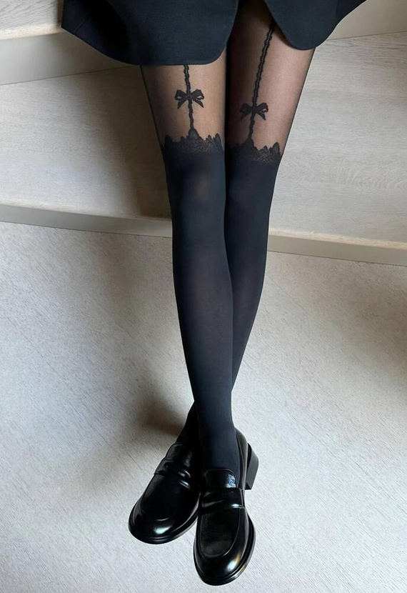 Auffällige Damenstrumpfhose im Overknee-Stil aus weicher Mikrofaser.Teilbedeckender Overkneestrumpf, 40 Denier,Strumpfhosen mit MusterMit Bogen 20 Höhle. Sie haben einen Baumwollzwickel.