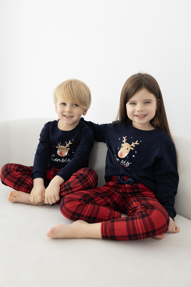 Entzückender Kinderpyjama aus hochwertiger Baumwolle. Langärmliges T-Shirt. Mit einem Aufdruck verziert. Lange, gemusterte Hose. Die Unterseite des Hemdes, die Manschetten und die Beine sind mit Manschetten versehen.