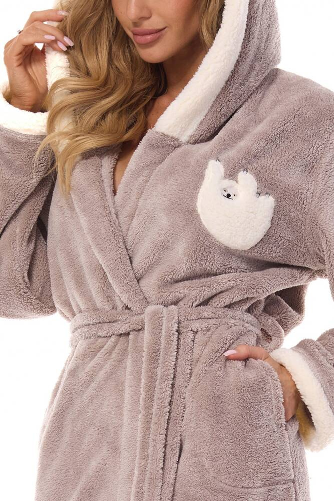 Produktionsland: POLENDamenbademantel mit Kapuze aus weichem Strick. Flauschige Applikation auf der Brust.