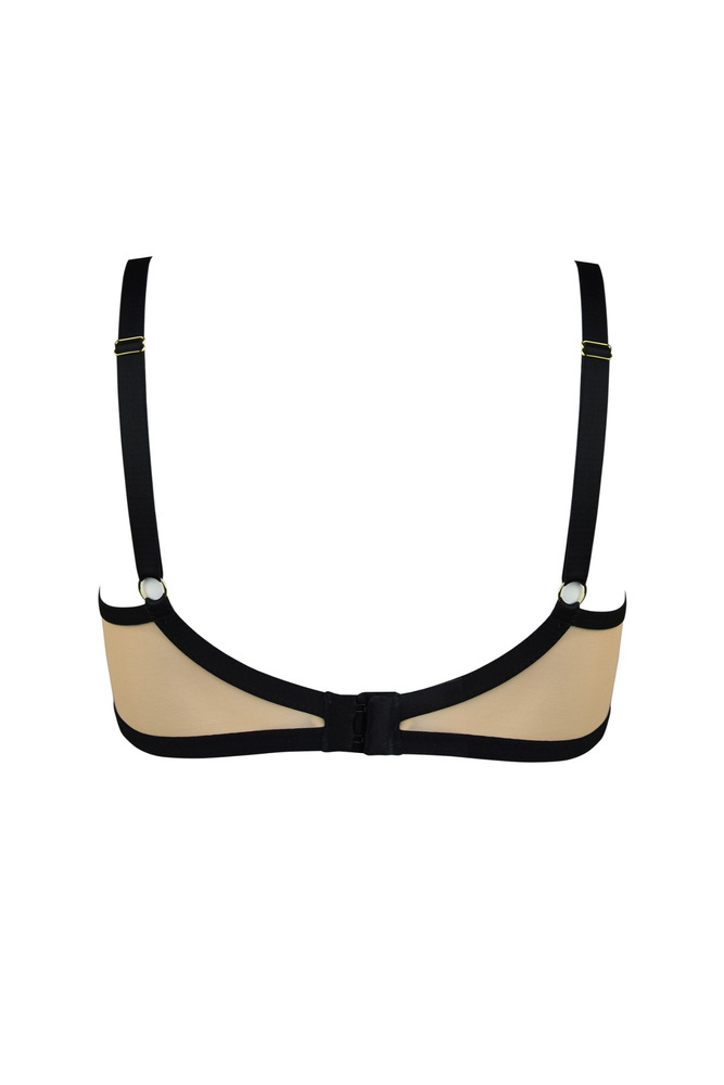 Tassen aus zartem Mokka-Netz sind mit üppiger Spitze mit Goldfäden verziert und verleihen dem Ganzen einen subtilen Glanz. Schwarze Borten betonen ästhetisch die vertikalen Schnitte und modellieren die Brust auf einzigartige Weise. Der Umfang besteht aus transparentem beigem Netz, das mit schwarzen Bändern kontrastiert