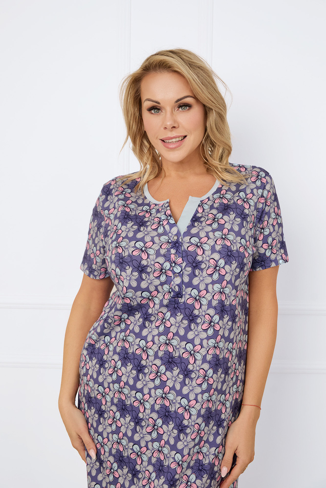 Das Nachthemd für Frauen ist eine Kombination aus Romantik und Eleganz. Es hat einen bequemen Kurzarm-Schnitt. Das Oberteil ist mit einem Rundhalsausschnitt mit kontrastierender Paspelierung und einem markanten Poloknopfverschluss variiert. Ein floraler Druck, der mit zarten Verzierungen versehen ist, verleiht dem Modell feminine Finesse. Dieses praktische knielange Modell ist aus weicher 100%iger Baumwolle gefertigt.