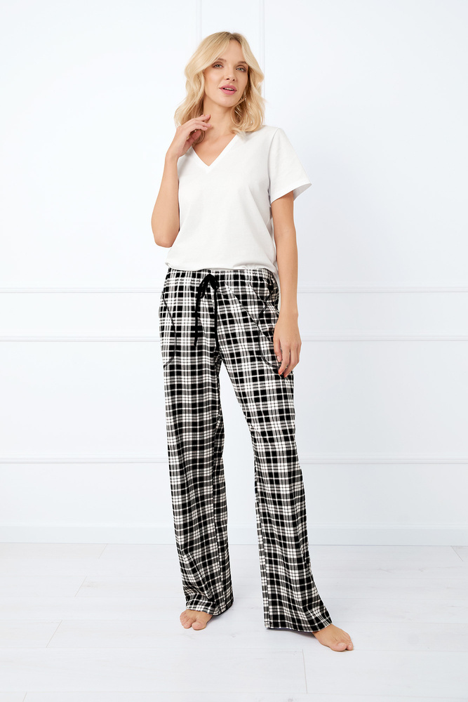 Lange Pyjamahose für Frauen, die für Komfort beim Schlafen und Entspannen sorgt. Mit klassischer, entspannter Passform. Druckfreier, elastischer Bund mit Zierkordel. Das ganze Teil ist mit einem Karomuster verziert und aus weicher und atmungsaktiver Baumwolle gefertigt, die sich für alle Jahreszeiten eignet.