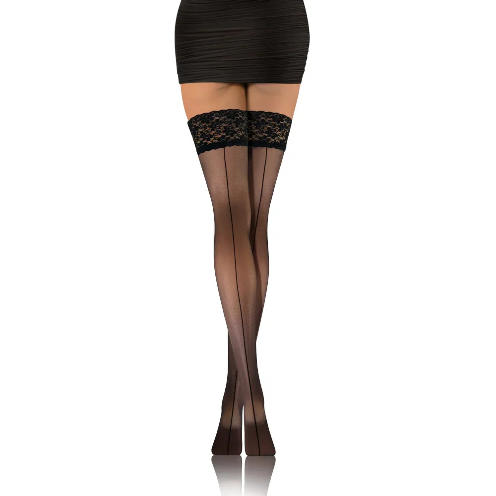 Klassische und elegante halterlose Strümpfe. Transparent und halbmatt mit Barfußeffekt. Dekorative Spitze mit Silikonstreifen hält die Strümpfe an Ihren Beinen. Dank ihrer Flexibilität passen sie sich perfekt dem Körper an und sorgen für einen einzigartigen Tragekomfort. Unersetzlich sowohl für den täglichen Gebrauch als auch für romantische Treffen.