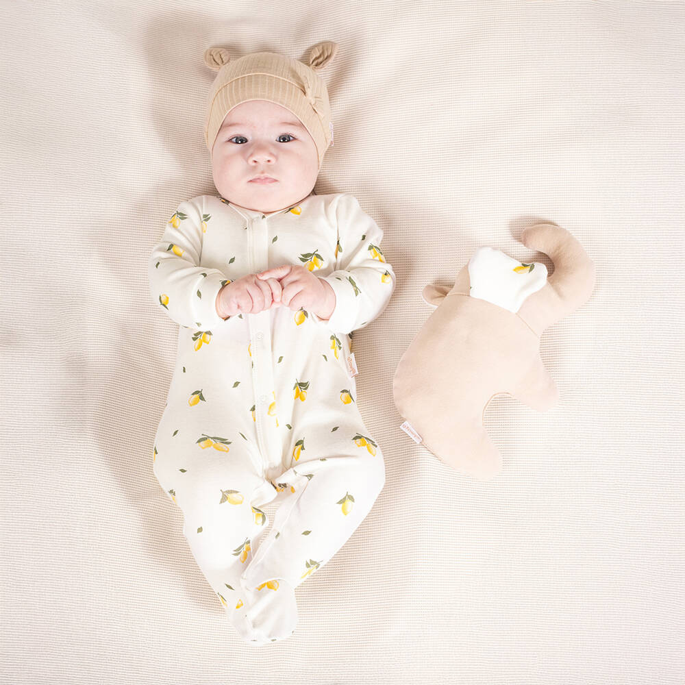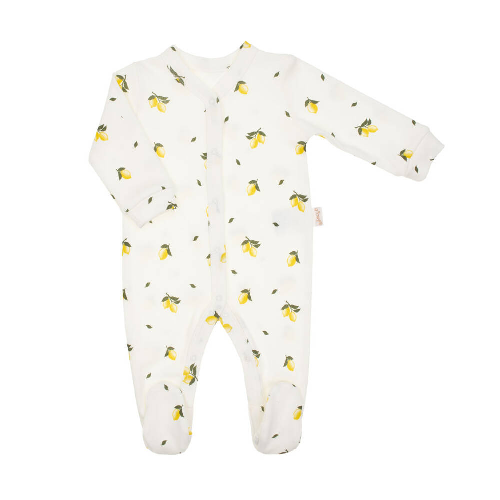 Ein weicher, cremefarbener Strampler mit Zitronen. Auf jeden Fall ein Muss für alle Eltern. Wird am gesamten Kleidungsstück mit bequemen, nickelfreien Druckknöpfen befestigt, um das Windelwechseln des Babys zu erleichtern. Hergestellt aus hochwertiger Baumwolle, zertifiziert nach Öko-Tex Standard 100. Vertrauenswürdige Textilien.