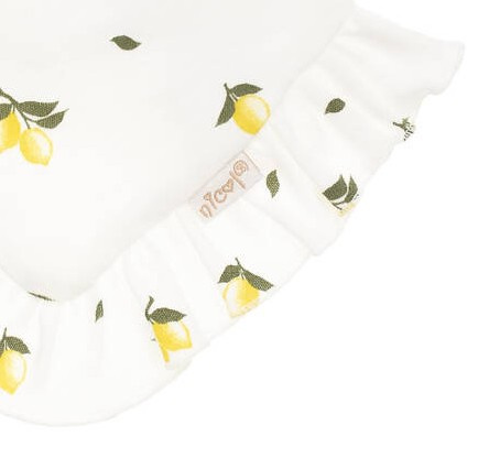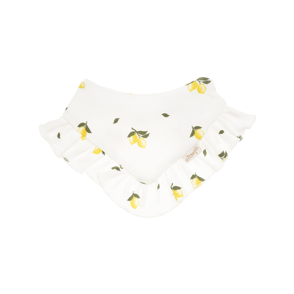 Ein cremefarbener Schal für ein Mädchen mit Zitronenmuster. Das Material verfügt über das Öko-Tex Standard 100 Trustworthy Textiles Zertifikat. Das Produkt wird mit nickelfreien Druckknöpfen auf der Rückseite befestigt. Die Rüsche sorgt für mädchenhaften Charme. Der Schal ist perfekt für kältere Tage und hat auch eine dekorative Funktion.