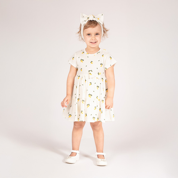 Stelle eine FrageStylischer Kleider-Body mit kurzen Ärmeln aus 100 % weißer Baumwolle mit Zitronenmuster. Das Material verfügt über das Öko-Tex Standard 100 Trustworthy Textiles Zertifikat. Im unteren Teil befinden sich zwei gekräuselte Rüschen, die dem Produkt ein elegantes Aussehen verleihen. Vorne mit einer Schleife verziert. Wird mit nickelfreien Druckknöpfen an der Schulter und unten befestigt. Dies erleichtert das Windelwechseln Ihres Babys.