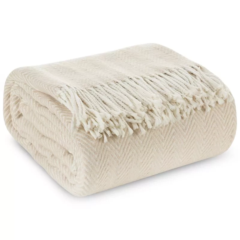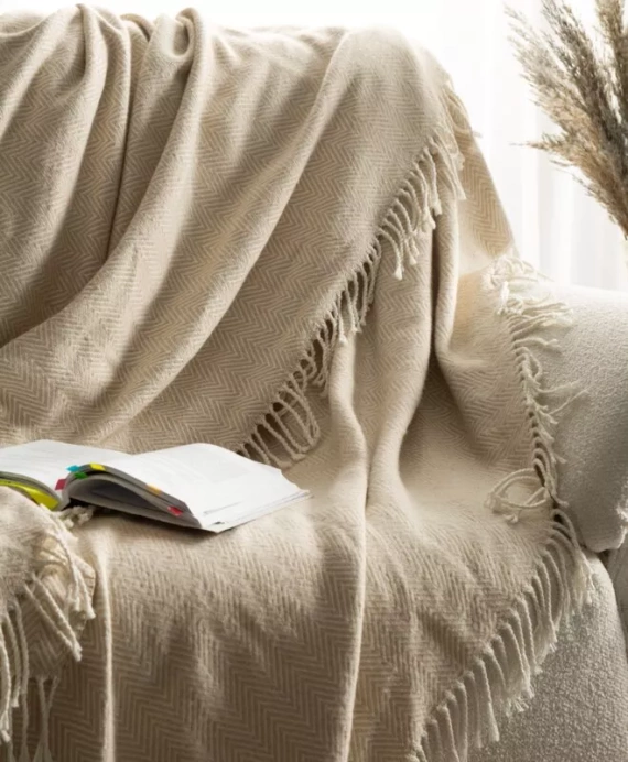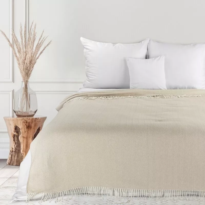 Eine elegante und außergewöhnlich weiche Ergänzung des Innenraums, die sowohl als Decke als auch als dekorative Tagesdecke oder Sofabezug verwendet werden kann. Es besteht aus einer Mischung aus Baumwolle und Acryl und zeichnet sich durch eine angenehme Karostruktur und dekorative Fransen aus. Die Beige- und Cremetöne verleihen ihm einen universellen und stilvollen Look und passen zu modernen und klassischen Arrangements.