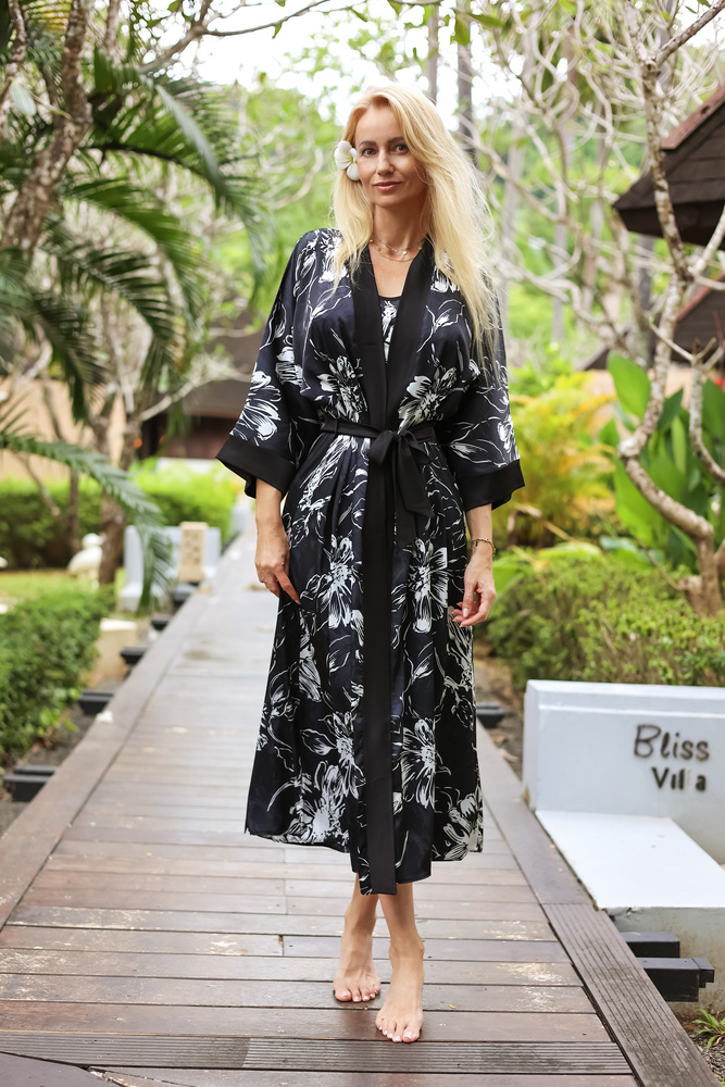 Entspannte Form mit weiten Ärmeln für Leichtigkeit und Eleganz. Hochwertig gemusterter Satin. Mit dem Gürtel können Sie die Taille nach Belieben einstellen. Sie können den Hausmantel auch als Überwurf für den Badeanzug verwenden.