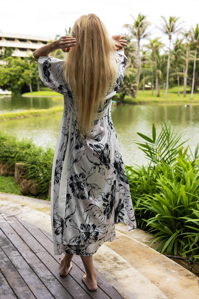 Entspannte Form mit weiten Ärmeln für Leichtigkeit und Eleganz. Hochwertig gemusterter Satin. Mit dem Gürtel können Sie die Taille nach Belieben einstellen. Sie können den Hausmantel auch als Überwurf für den Badeanzug verwenden.
