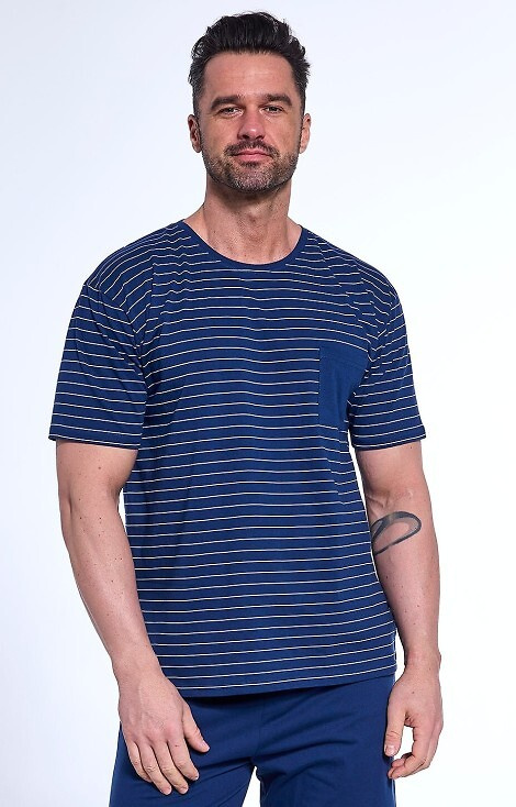Herrenpyjama aus hochwertiger Baumwolle. T-Shirt mit kurzen Ärmeln und Rundhalsausschnitt.