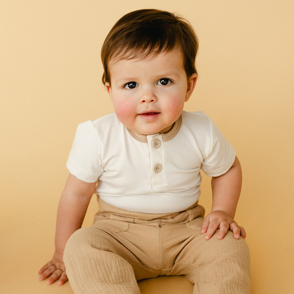 Kurzärmliger Polo-Body in Ecru. Kinderbodys sind perfekt für Kinder bis 3 Jahre. Am häufigsten wählen Mütter Bodys für ihre Babys. Dies ist ein Muss für jede Baby- oder Kindergartenausstattung.