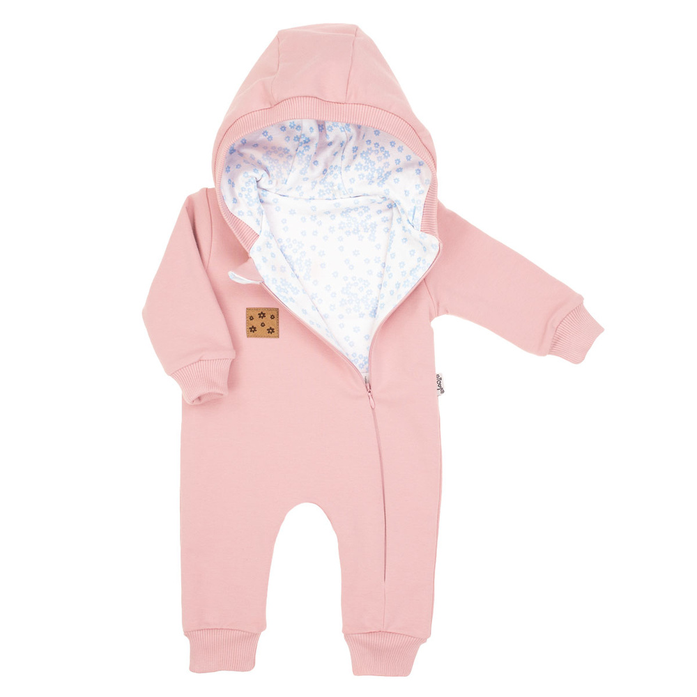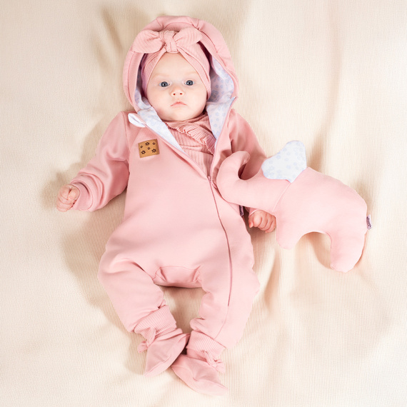 Ein Clown-Trainingsanzug aus rosa Sweatshirt-Baumwolle mit einem kleinen Elasthan-Anteil. Perfekt für einen Kinderwagen oder Autositz. Es hat Bündchen an den Ärmeln, Beinen und eine Kapuze mit Ohren. Dank der zertifizierten Baumwolle fühlt sich Ihr Kind darin wohl. Der Strampler wird mit einem praktischen Reißverschluss geschlossen – das erleichtert das Anziehen Ihres Babys.