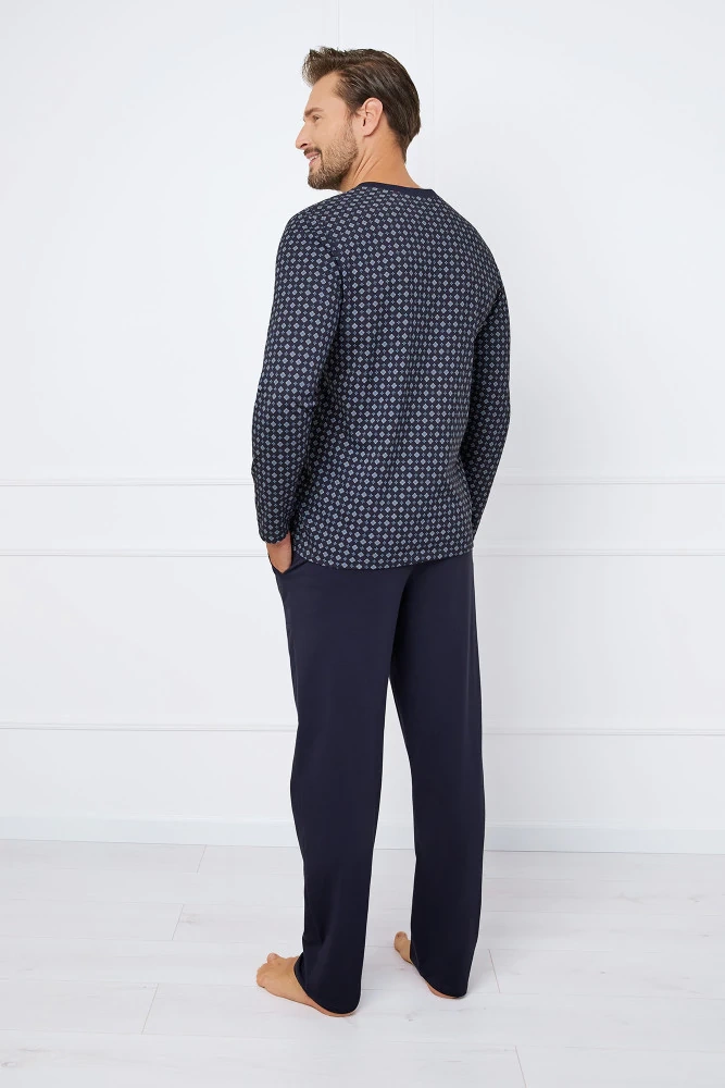 Der langärmelige Pyjama für Männer ist für Männer gedacht, die modische und stilvolle Nachtwäsche suchen. Der klassische Schnitt sorgt für ein angenehmes Schlafgefühl. Das Oberteil ist eine ungeknöpfte Bluse, bei der der gemusterte Druck im Duett mit einer auffälligen Knopfleiste in den Vordergrund tritt. Es hat zwei aufgesetzte Taschen. Die Unterteile sind lange, feste Hosen. Alle aus 100% Baumwolle.