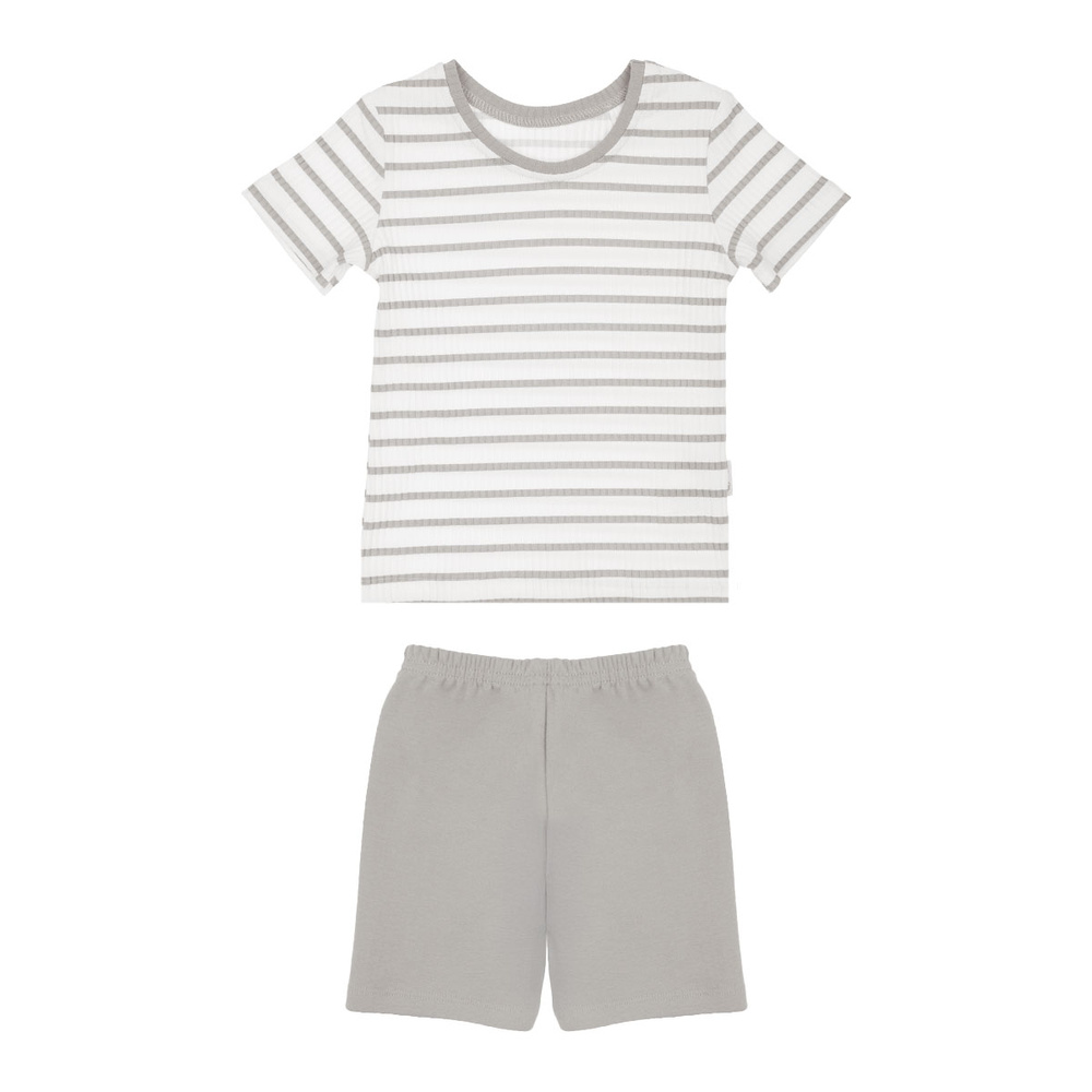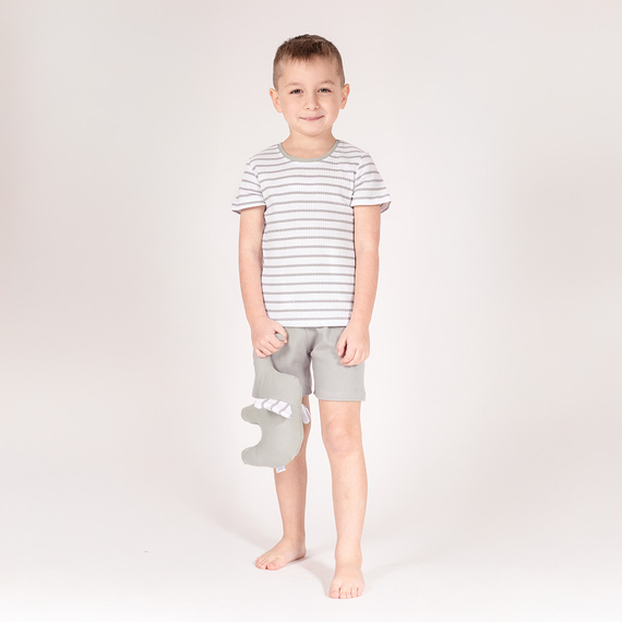 Stelle eine FrageKurzarm-Set aus Baumwolle für einen Jungen. Gestreiftes T-Shirt und graue Shorts. Es verfügt über das Öko-Tex Standard 100 Trustworthy Textiles-Zertifikat. Das gesamte Set ist locker geschnitten und passt somit zu jeder Figur. In die Shorts ist ein bequemer Gummizug eingenäht, der den Bauch nicht drückt, und zusätzlich vernäht, um ein Verdrehen zu verhindern.